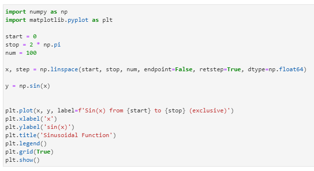 Supposons que nous voulons tracer une courbe sinusoïdale de 0 à 2π avec 100 points de données uniformément espacés, en excluant le point final 2π, et retourner également le pas entre les points. Utiliser des valeurs en virgule flottante de 64 bits.